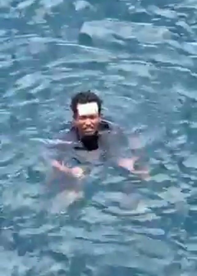 A person is swimming in blue water. The person is wearing a dark-colored shirt and has dark hair. The water appears to be clear and somewhat choppy. The person is smiling and appears to be enjoying themselves in the water. There are some indistinct voices heard in the background.