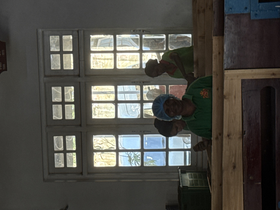 The image depicts an indoor scene in Ramboda, Sri Lanka, featuring three women within what appears to be a processing facility. A large, white-framed window unit with multiple panes, divided into three vertical sections, dominates the background, admitting significant natural light. In the foreground, a woman with dark skin, wearing a green collared shirt with an emblem on the right chest and a light blue disposable hairnet, smiles faintly while looking directly forward. Behind her and a prominent wooden structure that spans the lower half of the frame, two additional women are visible. The wooden structure consists of horizontal slats, consistent with drying racks or processing tables. To the immediate left of the foreground woman, partially obscured by the wooden structure, another woman with dark hair is seen, appearing to be engaged in an activity over the wooden structure. To the right, further back near the window, a third woman in a green shirt is observed bending over the wooden structure, also engaged in a task. A dark green container or bin is partially visible on the far left of the frame. A rectangular red sign is affixed to the upper wall, above the rightmost section of the window frame. The overall environment is brightly lit from behind, suggesting an active workspace.