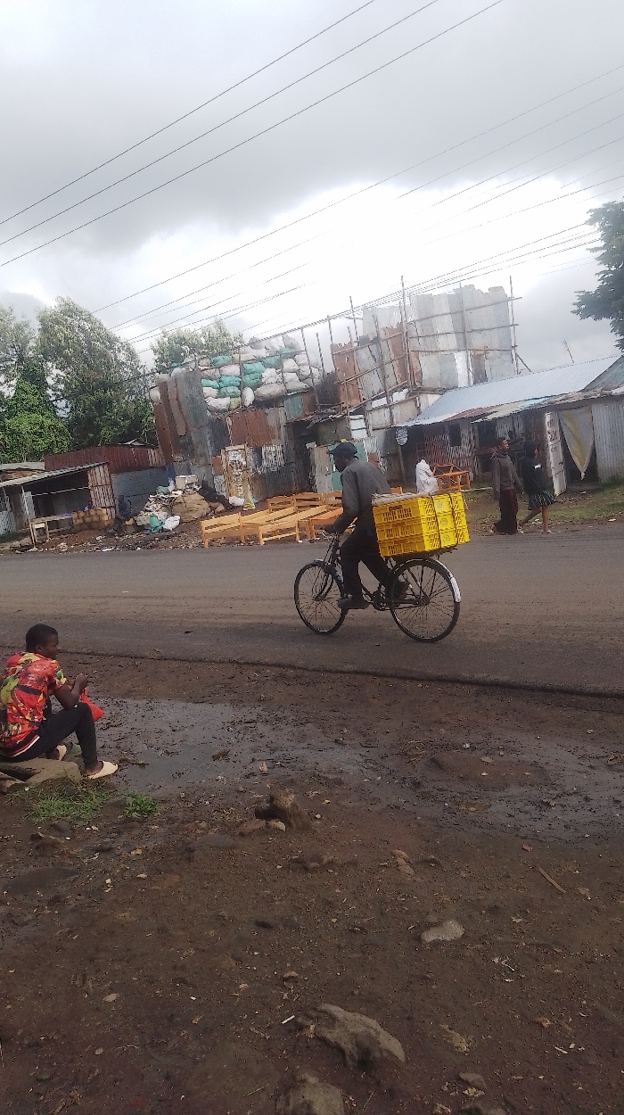 A man rides a bicycle down a street, carrying stacks of yellow crates. Across the street, a person sits on a curb. The setting appears to be a low-income neighborhood with weathered buildings. Some structures are made of corrugated metal and other found materials. The sky is overcast, with power lines visible. The road and ground are partially muddy. Other people are walking in the background.