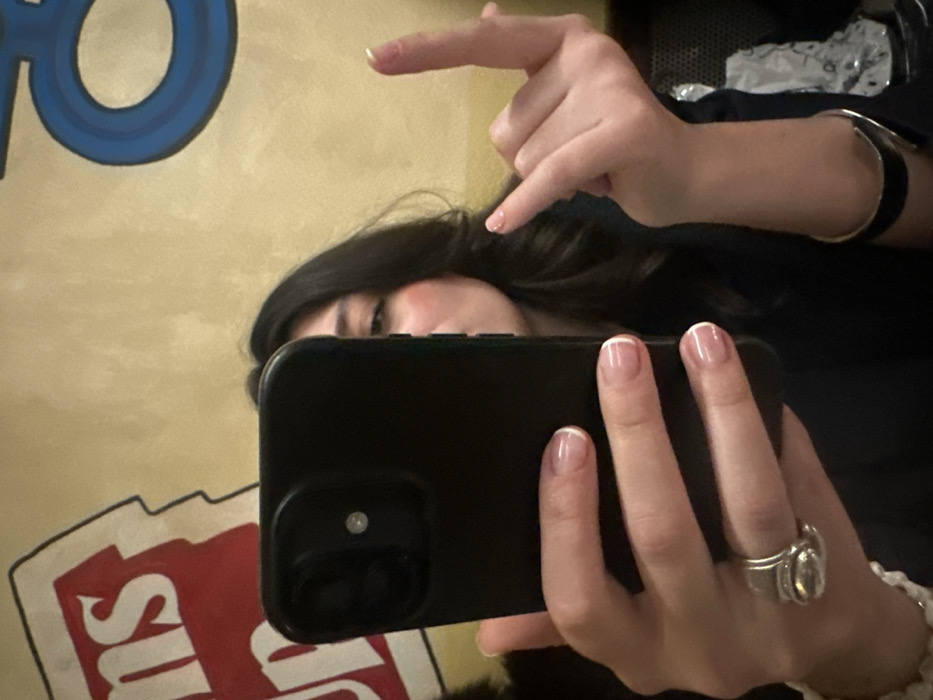 The image depicts a mirror selfie taken by an individual inside a **Bouillon Chartier restaurant in Paris, France**. A person, likely female, with dark hair, is partially visible, showing their right eye and cheek. They are holding a black smartphone with their left hand, angled to capture their reflection. The left hand displays French manicured nails, a large silver-toned ring on the ring finger, and a white beaded bracelet on the wrist. The person's right hand is raised, with the middle finger extended upwards in an obscene gesture; this hand also has French manicured nails. A dark-colored cuff-style bracelet is visible on the right wrist. The individual is wearing dark clothing. The background consists of a light tan wall. On the left, a partial red sign with white letters "ns" (from "Bouillons") and a jagged white outline is visible. On the right, a partial blue graphic, resembling a stylized "O" (from "Chartier"), is present. Below the blue graphic, an indistinct metallic or reflective object is partially obscured.