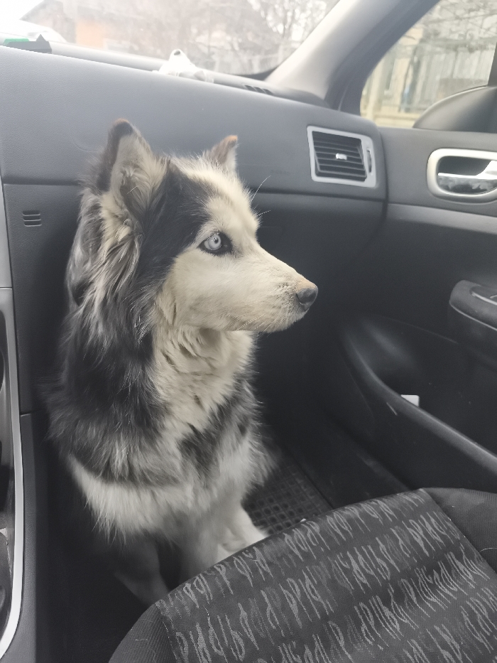 - "An Alaskan Husky or Siberian Husky-type dog with prominent blue eyes and distinctive black, white, and grey fur patterns is depicted seated on the front passenger side floor of a vehicle" by FM-AKM853, licensed under CC BY 4.0