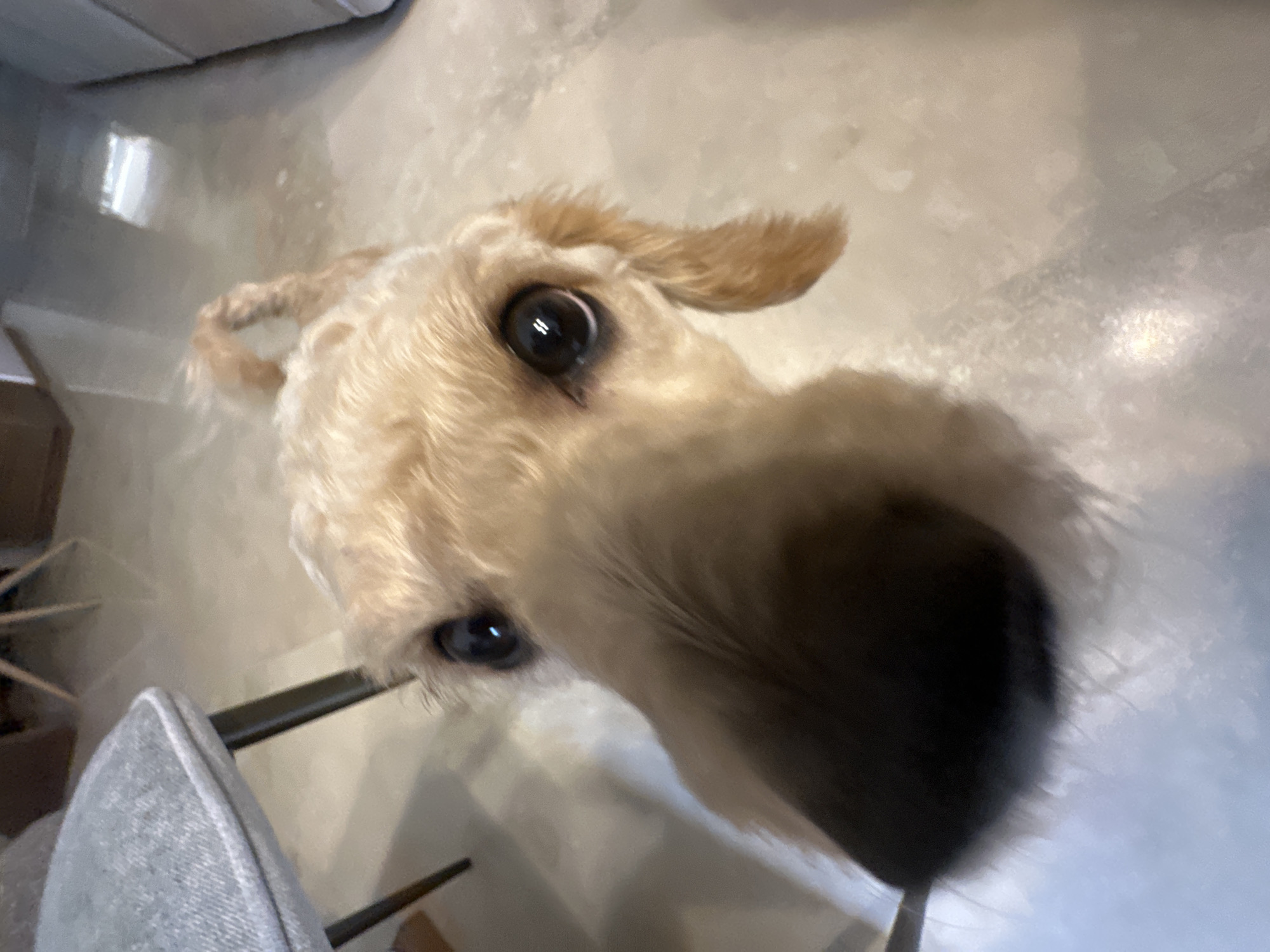 A close-up, high-angle view features the head of a light-colored, possibly Golden Doodle, dog. The dog's face dominates the frame with its large, dark eyes and a prominent, dark nose. The background appears to be an interior setting with a light-colored floor. A chair with a gray seat is partially visible in the lower-left corner. The location is not discernible from the image.