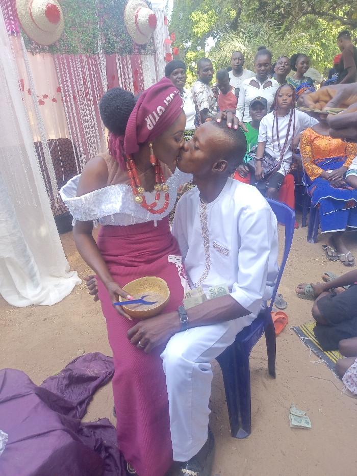 A bride and groom are kissing at an outdoor wedding. She wears a burgundy dress with a white, off-the-shoulder top and a matching burgundy headwrap. He wears a white shirt and pants. He sits in a blue plastic chair with money stacked in his lap. The bride holds a bowl with a blue spoon. Guests stand behind them. The wedding decorations include straw hats with red trim.