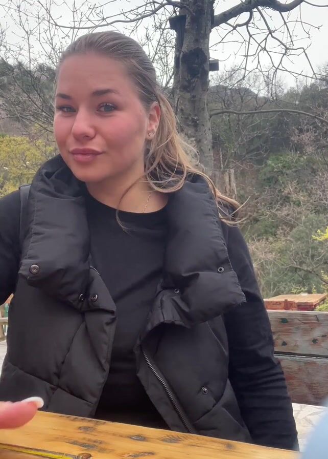 A young woman with light brown hair pulled back in a ponytail, wearing a black long-sleeved shirt and a black puffer vest, sits at a wooden table outdoors