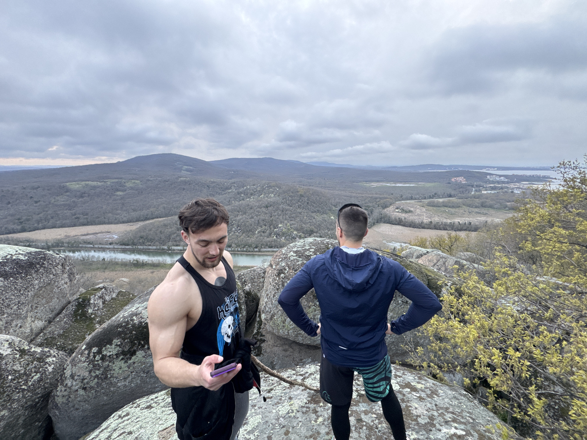 Two men stand atop a rocky outcrop overlooking a landscape with a cloudy sky overhead. The man on the left wears a black tank top and looks down at a mobile phone he holds in his hand. The man on the right has his back to the camera, wearing a navy hooded jacket and black shorts over leggings. The vista in the background includes hills and trees, with a body of water visible. Further in the distance, buildings can be seen along the coast. The location is near the city of Dyuni, Bulgaria.
