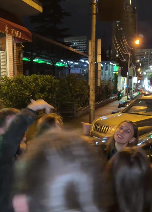group of six people on a city street at night. They are dancing and cheering. The people are dressed in a variety of outfits, including casual and more formal wear. A woman in the center of the group has green streaks in her brown hair and is holding a cell phone in her right hand. A man in a black jacket is to her right. Several cars can be seen on the street behind them. The building across the street has a sign on it that reads "RTVEL."
