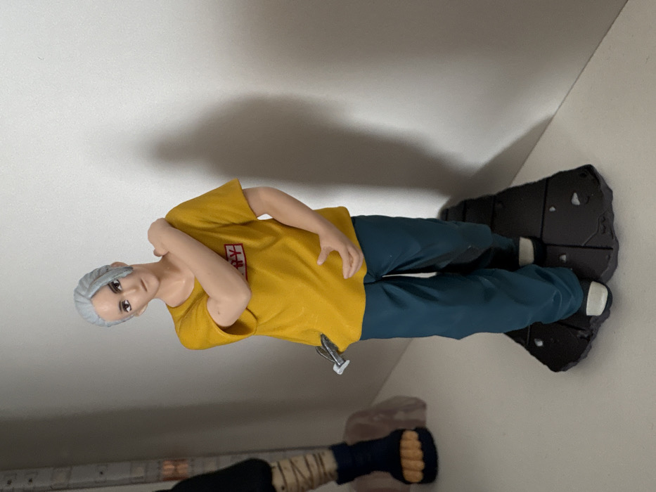 A plastic figurine of a male character stands upright, centered in the frame. The figure has fair skin and silver-grey hair styled in a side part. It wears a yellow short-sleeved t-shirt with a red rectangular graphic on the chest displaying partially visible white text, reading "HAPP Y". Teal-colored loose-fitting pants and black and white shoes complete the attire. The figure's right arm is bent, with the hand resting on its left shoulder, while the left hand is held slightly cupped near the waist. A small, metallic-silver object resembling a shuriken or stylized throwing blade is partially inserted into the left side of the yellow t-shirt at the waistline. The figure stands on a dark, textured base that mimics cracked or broken ground. The background consists of a plain, off-white wall. To the left and slightly behind the main figure, the lower portion of another figurine is visible, showing a bandaged leg, dark blue sandal-like footwear, and a brown base. The scene is illuminated, casting a faint shadow of the main figure on the wall behind it.
