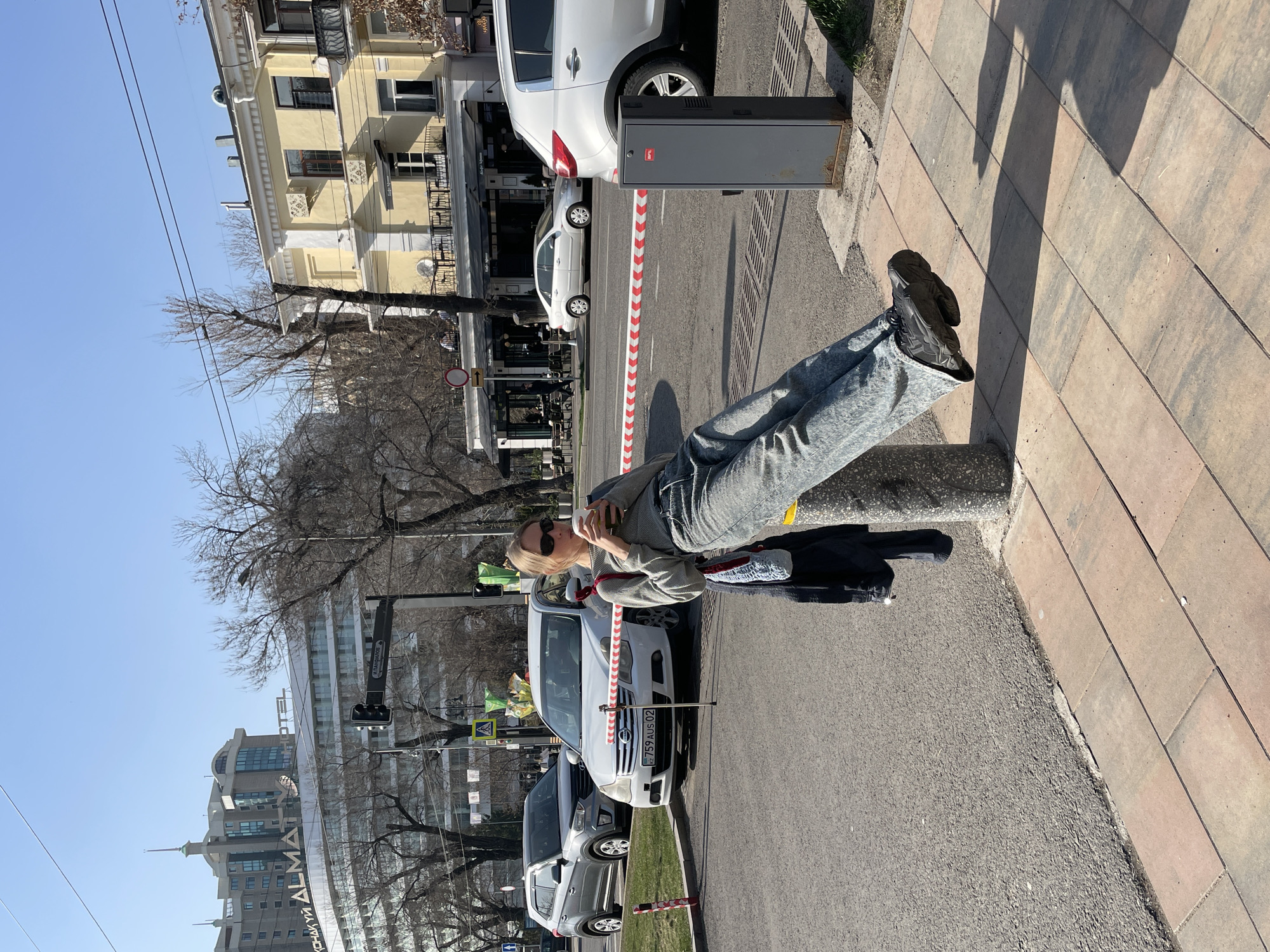 The image depicts an urban street scene in Almaty, Kazakhstan, specifically on or near Panfilov Street, with the Grand Hotel Tien Shan visible in the background. In the foreground, a person, appearing female, with blonde hair and sunglasses, is positioned leaning against a grey concrete bollard or barrier post. They wear a grey long-sleeved top and light blue jeans, with their legs extended horizontally, creating the illusion of floating above the brown paved sidewalk. The person is holding a white cup with a green interior, from which they appear to be drinking. A dark garment is draped over the bollard beneath their left arm. They are wearing dark sneakers. Behind the person, a red and white striped barrier arm extends across an asphalt roadway. To the right of the barrier, a grey metal control box is visible. Two vehicles are present on the street behind the barrier: a white Nissan sedan (license plate 759 AUS 02, Kazakhstan registration) and a grey Hyundai Creta SUV. In the mid-ground, across the street, a multi-story yellow building with balconies and black awnings is visible, housing establishments including one with "Kaffe" signage. Several individuals are discernible on the balconies and sidewalk. Further in the background, a large, modern, light-colored hotel building with "ALMA" and "OTEL" signage is prominent under a clear blue sky. Bare deciduous trees are interspersed throughout the urban landscape. Traffic lights, overhead wires, and a pedestrian crossing sign are also visible. The scene is illuminated by bright daylight, casting distinct shadows on the ground.