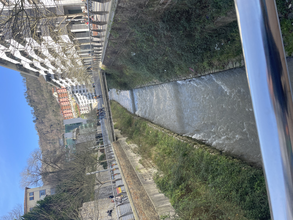 The image depicts an elevated view looking southeast along the Ego River in Eibar, Spain, from what appears to be a bridge or an elevated structure. The river, a channeled waterway with concrete and stone retaining walls, flows from the mid-ground towards the foreground, characterized by grayish-brown, turbulent water with visible small weirs creating white foam. Both riverbanks are heavily overgrown with green vegetation. In the mid-ground, a pedestrian bridge crosses the Ego River. Approximately five individuals are visible walking across this bridge from left to right. On the left (south) side of the river, an elevated promenade runs parallel, featuring a continuous metal railing and several leafless deciduous trees. Approximately three pedestrians are visible on this promenade, and a section of a railing or banner with yellow and red stripes is discernible. Behind this promenade, a dense urban environment unfolds, including a light-colored multi-story building, a modern structure with a prominent glass facade, and several residential buildings climbing a steep, heavily wooded hillside in the background. On the right (north) side of the river, another elevated promenade is visible, lined with modern, multi-story white and grey residential buildings featuring balconies. Leafless trees are spaced along this promenade, and several individuals are present, some walking and others seated at outdoor tables. The sky is clear and blue, indicating bright daylight conditions, and shadows are distinct. A chrome-plated metal handrail partially occupies the bottom of the foreground, suggesting the viewer's immediate vantage point.