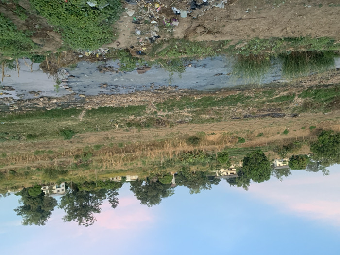 The image captures a landscape in Jos, Nigeria, under a light blue sky with subtle pink hues. In the foreground, the immediate riverbank consists of dry earth and sparse green vegetation, featuring an accumulation of refuse, including plastic bags, bottles, and other debris. A narrow, shallow stream flows across the mid-ground, its murky water containing visible rocks and detritus. Clumps of tall green reeds or grasses grow along the stream's edge. Beyond the stream, a sloped hillside rises, covered in dry, light brown soil and interspersed green foliage, with visible rows of cultivated, dry vegetation, likely agricultural crops. On the upper portion of the hillside and skyline, several light-colored, multi-story residential structures with brown roofs are visible, nestled among numerous mature trees with dense green foliage. No individuals are present, and no specific actions or interactions are observed within the scene.