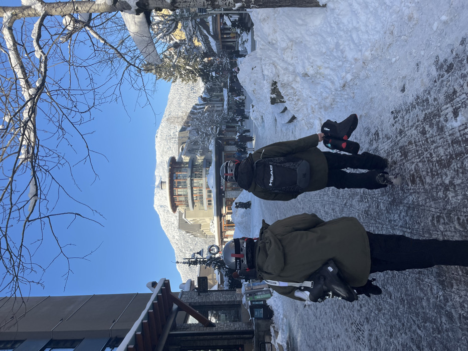 Two people in winter jackets, helmets, and carrying ski boots walk on a snowy path. One person has a black backpack with the word "HEAD" printed on it. The background features buildings and snow-covered mountains under a clear, blue sky. Bare tree branches are visible in the upper left corner. The scene appears to be a ski resort town.