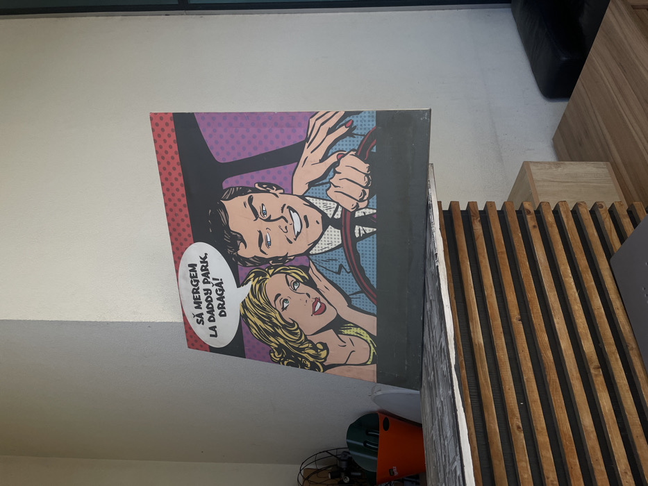 A large pop art style canvas painting is displayed vertically, leaning against a light-colored wall and resting on a horizontally slatted wooden surface