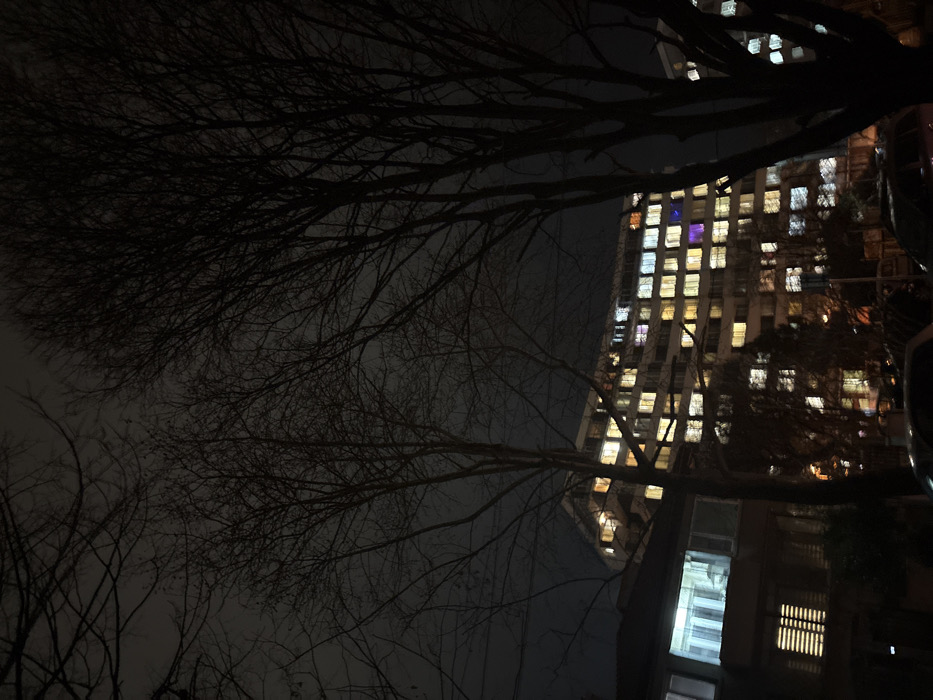 The scene depicts an urban residential area in Varna, Bulgaria, observed at nighttime. The sky is dark and appears overcast. Silhouettes of several large, bare-branched deciduous trees dominate the foreground and upper portions of the image, obscuring parts of the view. In the midground, a prominent multi-story apartment building, exhibiting a slightly curved facade, stands as the central subject. Its numerous windows across all visible floors are illuminated, displaying a variety of light colors, primarily warm yellow-orange and cool white-blue, with sporadic instances of purple and pink light emanating from individual units. To the left, a portion of a smaller, two-story residential structure is visible. Its upper-level window is brightly lit, revealing white curtains, while a lower window shows interior illumination behind closed horizontal blinds. The lower section of the image captures the dark upper surfaces of multiple parked automobiles, suggesting a street or parking area. No human figures or discernible activities are present.