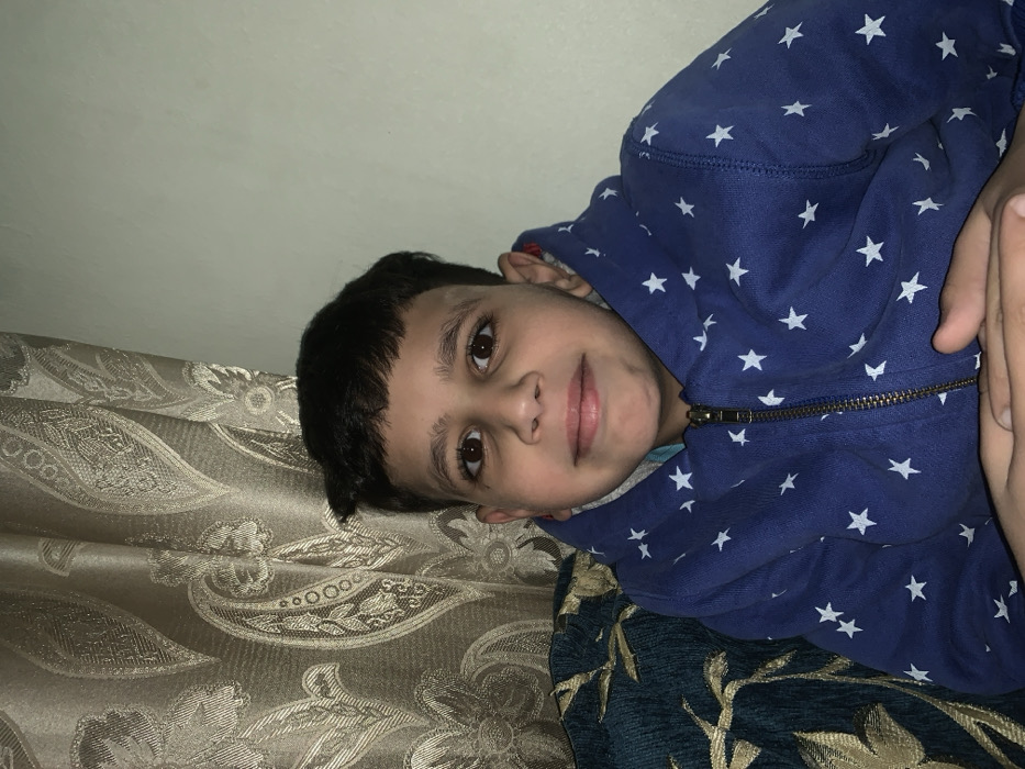 A young boy with dark hair and brown eyes lies on a bed. He is wearing a blue zip-up hoodie patterned with white stars. His face is turned towards the camera with a slight smile. He appears to be reclining on a patterned bedspread. The background is a light-colored wall. The boy’s left hand is slightly visible near his chest.