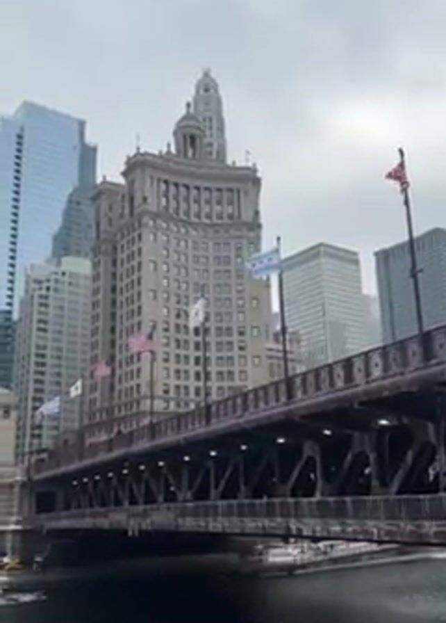 The video presents a view of a city river, possibly in Chicago, given the architecture and presence of US and Illinois state flags
