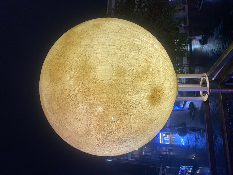 A large, illuminated spherical object, detailed to resemble a full moon with textured crater patterns and emitting a yellowish-orange glow, occupies the central and upper portions of the frame