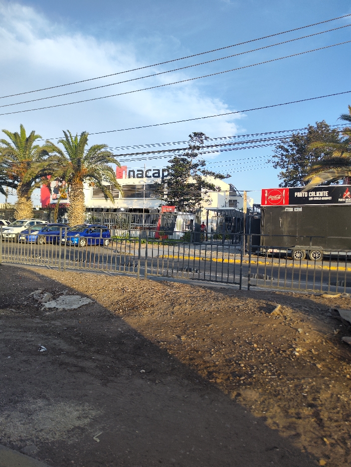 building labeled "Inacap" behind a metal fence, flanked by palm trees. Several cars are parked in front of the building. A dark trailer with Coca-Cola and "Punto Caliente" branding stands to the right, also behind the fence. The foreground depicts a rough, dirt-covered surface with patches of light and shadow. Power lines stretch across the sky.