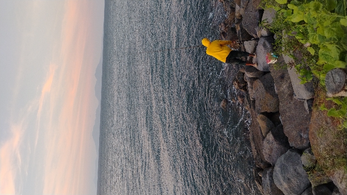 The image depicts a coastal scene in Banda Aceh, Indonesia, at either dawn or dusk. A single individual, positioned with their back to the viewer and slightly off-center right, is engaged in fishing from a rocky shoreline. The person wears a bright yellow hooded jacket and dark pants, standing on large, irregular grey rocks that form the water's edge. A fishing rod is held by the individual, extending into the open sea. Near the individual's feet, a white plastic bucket with red and green accents rests on a rock. The foreground includes green foliage and parts of cut logs on the landward side of the rocks. The water, a dark grey-blue, shows ripples and minor surface agitation, extending across the mid-ground. Faint silhouettes of distant mountains or landmasses are visible on the horizon. The sky exhibits soft pastel colors of pink, orange, and light blue, indicative of low light conditions.