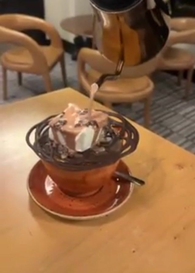 A hand pours chocolate sauce from a silver kettle over a cup of hot chocolate