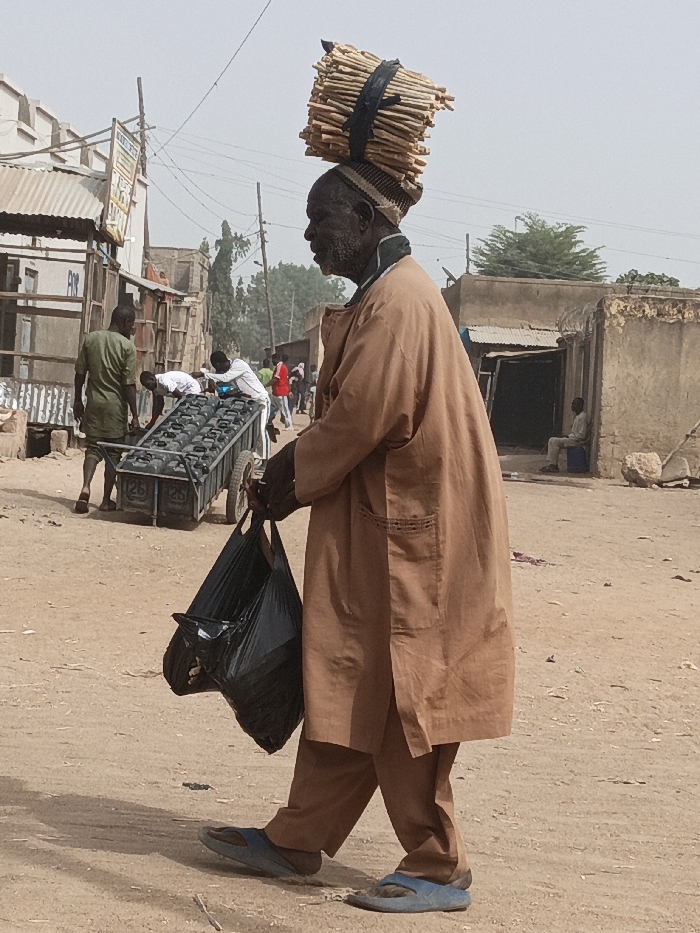 The scene depicts an active, unpaved street in the city of Zango, Nigeria, under a hazy daytime sky. In the foreground, an older adult male, with visible gray facial hair, walks leftward, slightly angled towards the viewer. He wears a light brown, long-sleeved tunic over matching trousers and blue flip-flop sandals. On his head, he balances a large, tightly bundled stack of light-colored wooden sticks, secured with black straps over a striped head wrap. He carries two black plastic bags in his left hand. In the mid-ground to the left, two younger adult males interact with a metal handcart loaded with numerous dark-colored, rectangular plastic jerrycans, some marked with "25", stacked approximately three high. One man, dressed in a green shirt and brown sandals, walks alongside the cart, while another, in a white shirt, is bent over it, appearing to manage its contents. Several other individuals are visible in the background, moving between structures. The environment features a dusty, light brown ground surface. Buildings line both sides of the street; those on the left have corrugated metal roofs and utility poles with overhead wires. On the right, single-story structures with light-colored walls, possibly mud-rendered, are present. A lone male individual is seated on a low object near an open doorway of a building on the far right. Sparse green foliage is visible behind the structures on the right.