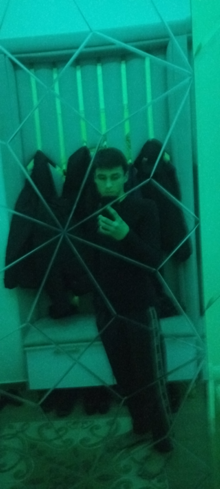 A young man in a dark outfit stands indoors, reflected in a fragmented mirror. The mirror's geometric design distorts the image, creating multiple perspectives. A coat hangs behind him. A patterned rug lies on the floor. The entire scene is bathed in green light, lending an eerie and unnatural ambiance to the reflection. The focus remains on the man and his distorted reflection.