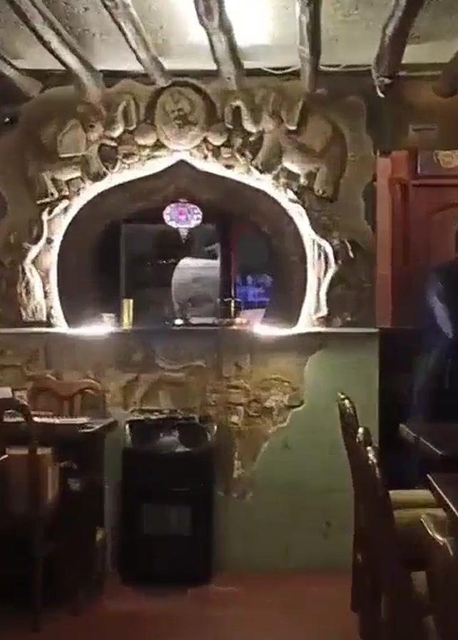 interior of a restaurant. The restaurant has a rustic decor with wooden beams on the ceiling, stone-like walls, and wooden furniture. There is a large, decorative archway over what appears to be a service area. The flooring is tiled in a reddish-brown color. People are visible in the background and a person walks past the camera in the foreground. The lighting is warm and somewhat dim.
