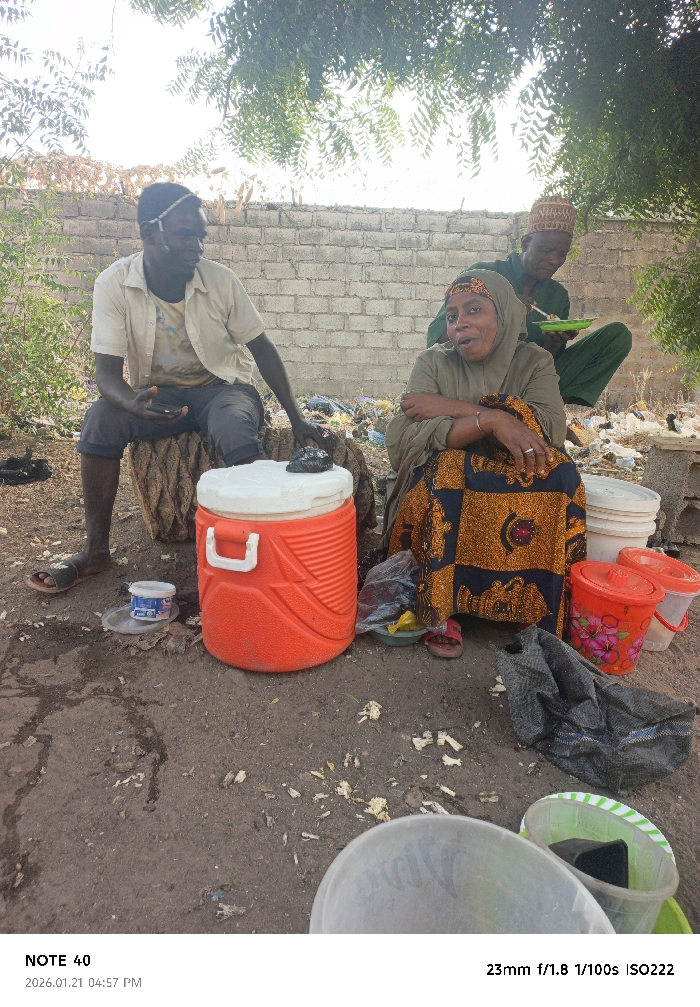 Three people are gathered outdoors. A man sits on a tree stump, holding a phone. Next to him, a woman in a hijab and patterned dress sits with crossed arms. Behind her, another man is sitting and eating from a green plate. An orange cooler sits on the ground. Other items include buckets, bowls, and some trash scattered around. A brick wall is visible in the background with trees hanging above.