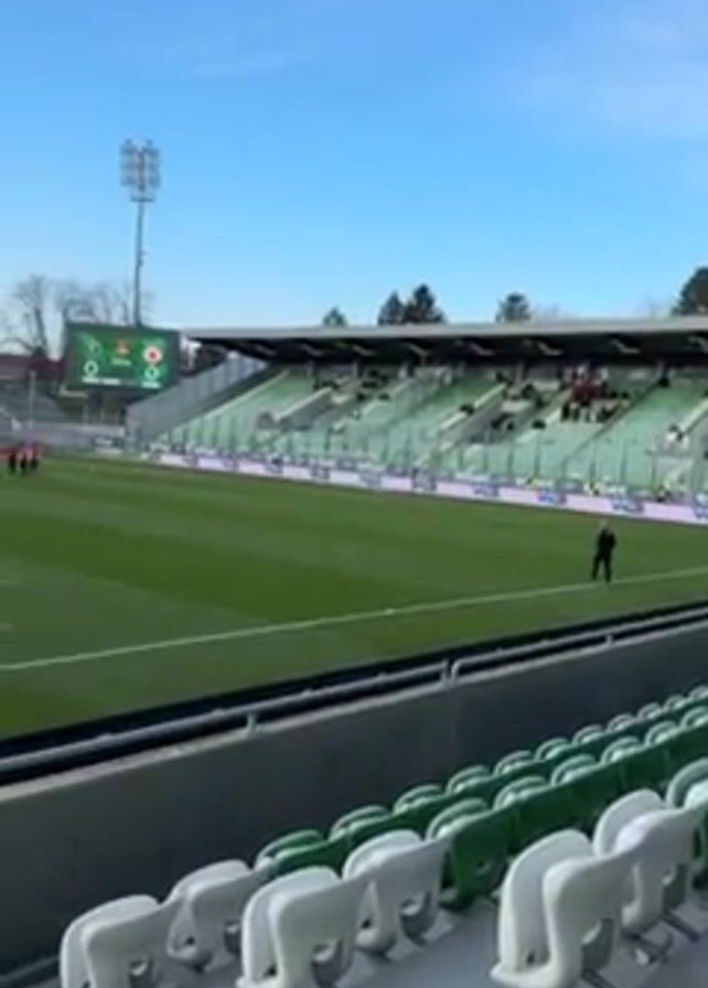 inside of a soccer stadium on a sunny day. The seats are green and white. A few people can be seen on the field and in the stands. A digital scoreboard is visible. The field is a vibrant green. The sky is blue with some clouds.
