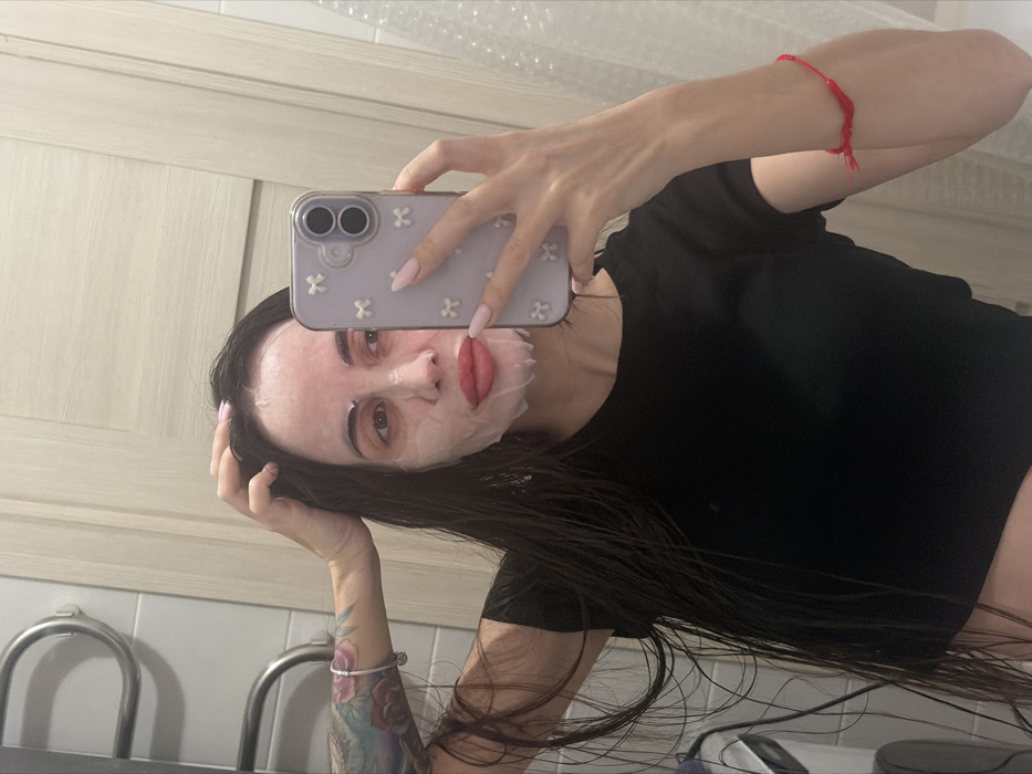 A female individual is depicted taking a mirror selfie in what appears to be a bathroom setting. Her face is covered with a white sheet mask, which has cutouts for the eyes, nostrils, and a mouth revealing prominent red lipstick. Her long, dark hair appears wet, and her left hand is positioned within it near her scalp. Her left arm displays a colorful, multi-hued floral tattoo extending from the upper arm to the forearm, and a silver-colored charm bracelet is visible on her left wrist. A red string bracelet is present on her right wrist. She wears a black, short-sleeved crop top that exposes her midriff. In her right hand, she holds a light purple smartphone with a transparent case adorned with multiple white bow-shaped embellishments. Her fingernails are long and painted a light pink or nude color. The background consists of light-colored tiled walls, a chrome towel warmer visible on the upper left, and a light-colored wooden door or panel on the right. The precise location within the city of Novosaratovka, Russia, is not discernible from the image data.