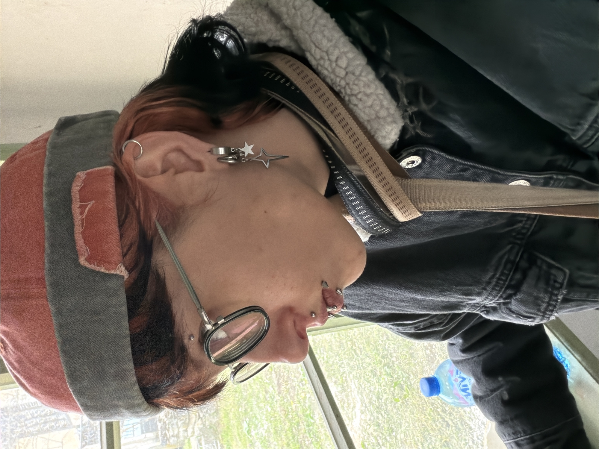A person wearing glasses, a hat, and a jacket is positioned indoors, possibly in front of a window with a view of greenery. The person has multiple ear piercings and piercings around the mouth. A water bottle is visible near the window. No definitive evidence suggests this is in Karlukovo, Bulgaria.