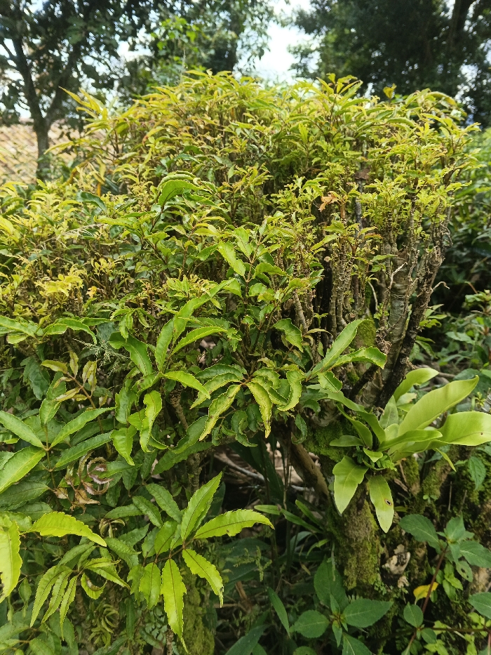 A vibrant bush dominates the frame, showcasing a mix of bright green and yellow-tinged foliage. The leaves exhibit a pronounced venation pattern. Several stalks create a dense base for the bush, with some supporting moss growth. A cluster of ferns clings to a stalk. Surrounding the bush, smaller green plants and fallen leaves intermingle, adding to the natural, untamed aesthetic of the scene. The background reveals glimpses of trees and a possible roof, hinting at a garden or natural area.