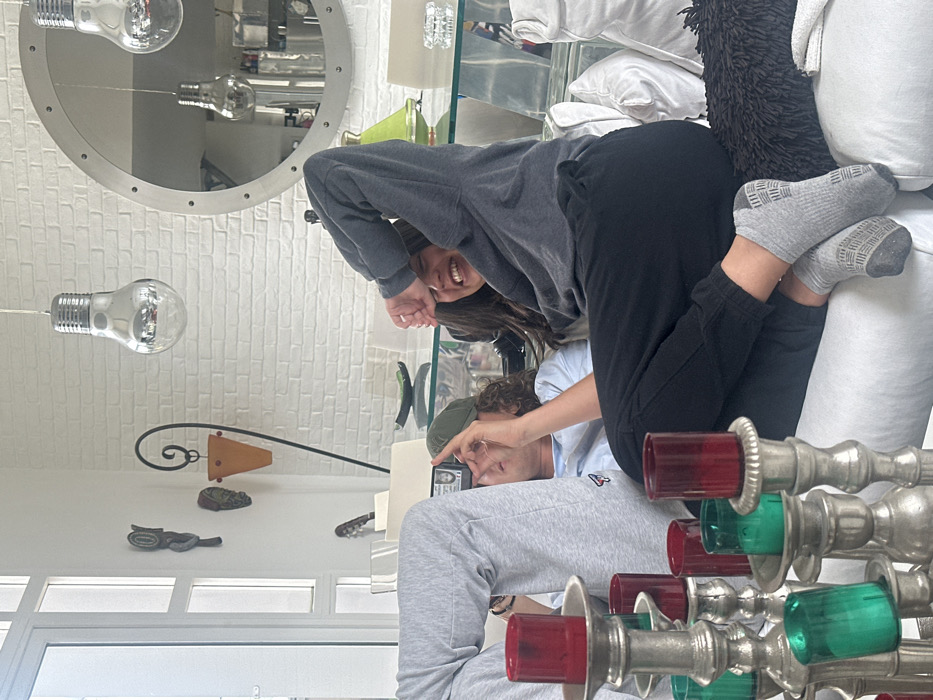 This image captures two individuals lounging casually on a white sofa inside a modern apartment in Paris, France. A male individual, wearing light grey sweatpants, a light blue t-shirt, and a dark green baseball cap, is reclined with his knees bent and raised. He is holding a small electronic device between his knees, appearing to interact with it. A female individual, dressed in a dark grey long-sleeved top, black sweatpants, and grey ankle socks with non-slip grips, is positioned next to him, smiling broadly with her left arm raised, hand partially obscuring her face. Her right leg is bent and rests over the male's legs. In the immediate foreground, a multi-tiered silver candelabra with several red and green glass candleholders is prominently displayed, out of focus. The background reveals a contemporary living space with white brick-patterned walls and large windows. A glass dining table with white chairs is visible, along with a large circular mirror framed in metal with rivets. Wall decor includes abstract elements and a tall black metal floor lamp with an orange glass shade. Two large, reflective, bulb-shaped pendant lights hang from the ceiling.
