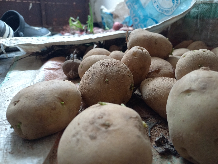 - "The image presents a low-angle, close-up view of numerous light brown potatoes, many exhibiting small green sprouts, resting on a textured ground surface in Karmajiji, Nigeria" by FM-dSFJt1, licensed under CC BY 4.0