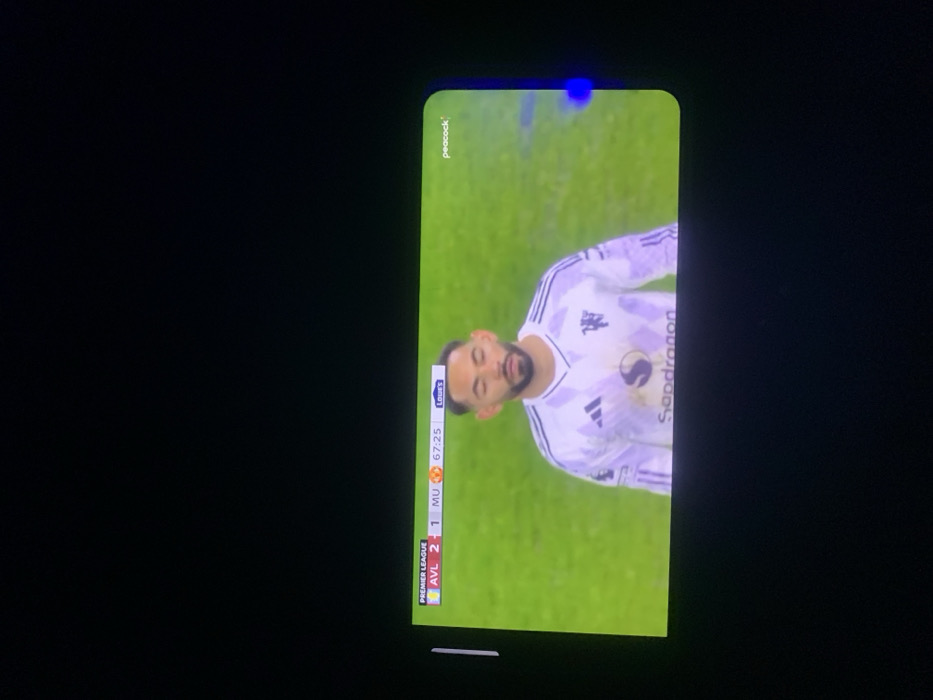 phone displaying a soccer game on the Peacock streaming service. The match is between Aston Villa (AVL), leading 2-1 against Manchester United (MU). The game clock shows 67:25. A player in a white and light purple jersey is visible on the screen. The phone's screen is brightly lit against a dark background.