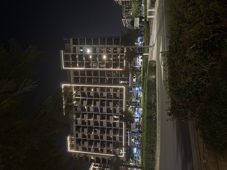 Illuminated buildings stand tall against a night sky, their rectangular architecture emphasized by linear lights. Adjacent, a sidewalk is flanked by manicured hedges and greenery. A street lamp casts a glow, highlighting the dark asphalt. The scene has an urban, modern feel, with the interplay of light and shadow creating a contrasting yet balanced composition.