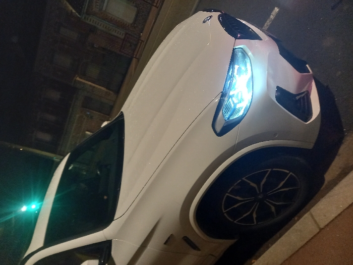 A white BMW X3 sits parked at an angle on a street with a sidewalk. The car's front is clearly visible, with its headlights shining brightly. The tires and rims are also prominent, and the background includes a building with windows and a street setting. The angle is a close-up shot.