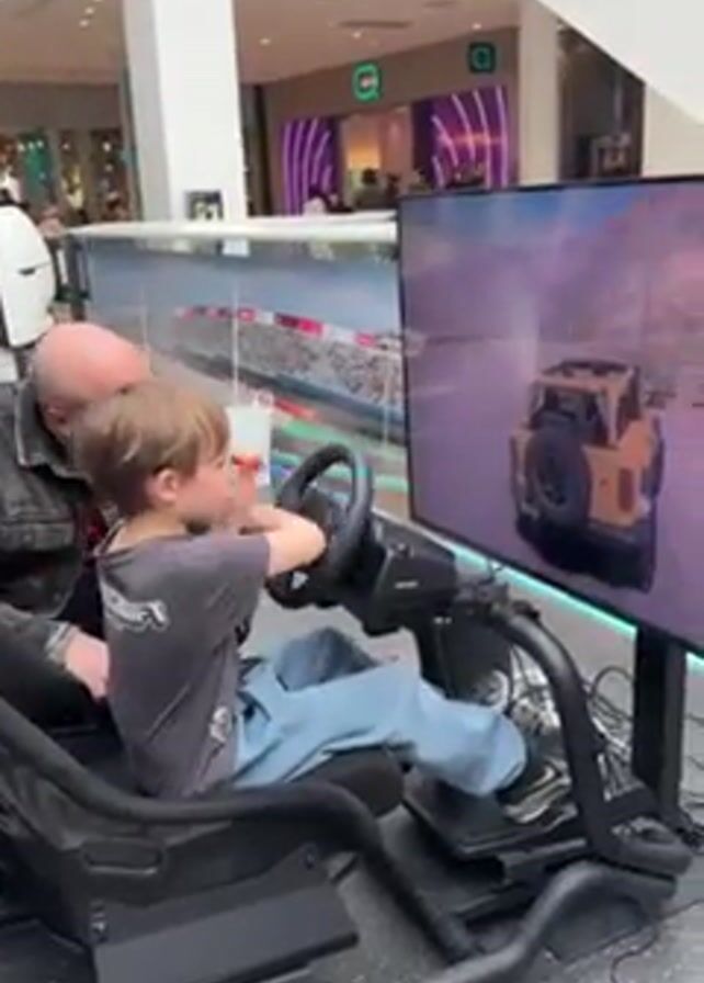 In a shopping mall, a young boy sits in a black “UVI RACING SIMULATOR PRO V2” and plays a car racing video game. He grips the steering wheel with both hands and appears focused on the screen. To the boy’s left, a bald adult male leans in and provides guidance, occasionally placing a hand on the steering wheel. The game screen shows a yellow SUV driving along a dirt road. In the background, there are shops and other mall patrons visible. The lighting is bright, typical of indoor commercial spaces. The boy wears a grey t-shirt and blue jeans, while the adult wears a dark jacket over a red shirt.