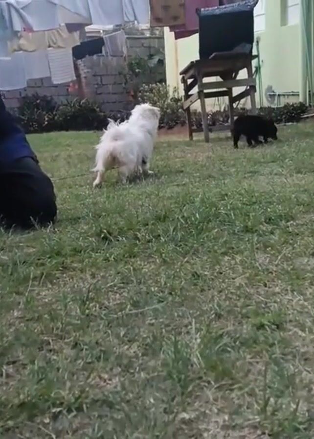 The scene unfolds in a grassy backyard, where a person kneels, holding a leash attached to a small white dog. The dog, with a slightly wet coat, stands alert and barks. In the background, a smaller black dog is also present. Laundry hangs on a clothesline, and other objects like furniture and a bicycle are visible. The backyard is enclosed by a fence, and a green building can be seen in the background.