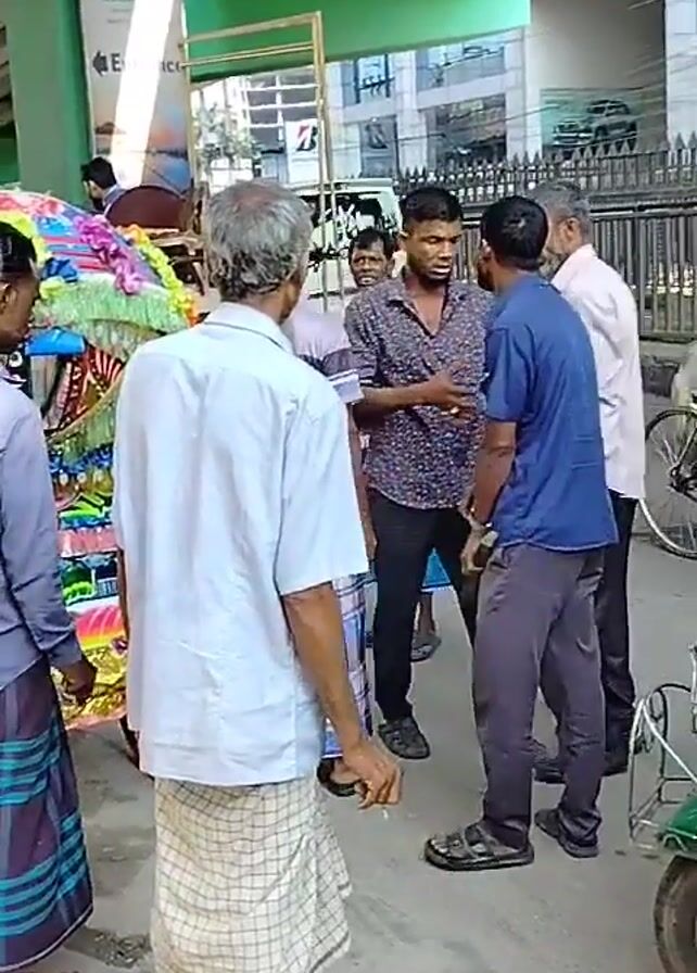group of around eight men standing in a semi-circle on a city street. Several of the men wear lungis, a type of skirt, while others are dressed in shirts and pants. One man in a blue shirt and gray pants appears to be the center of attention, as others around him gesture and talk towards him. Another man in a purple and blue lungi and a light-colored shirt holds his hands up as if trying to mediate. To the left is a cart decorated with colorful streamers and ornaments. In the background are buildings and a metal fence. The street surface is damp and gray.