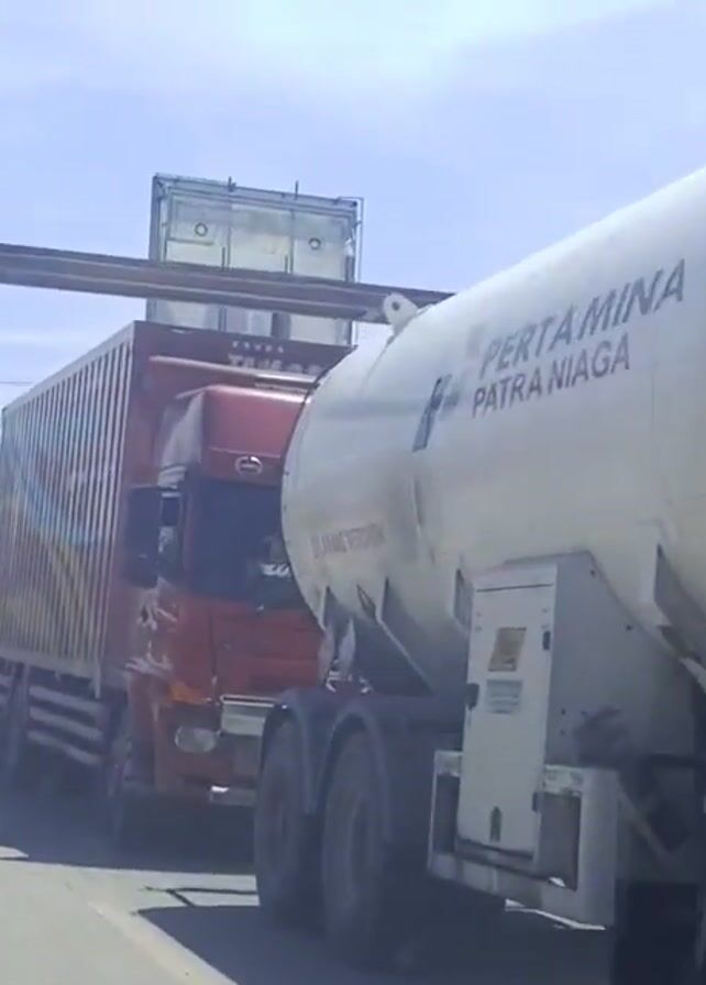 street scene with various trucks. A large white tanker truck with the inscription "PERTAMINA" is in the foreground. A red truck with a container is behind it. The camera then pans to show a white truck with a blue frame and an Isuzu logo. The scene is bright and sunny. The trucks appear to be driving on a road in a town or city.