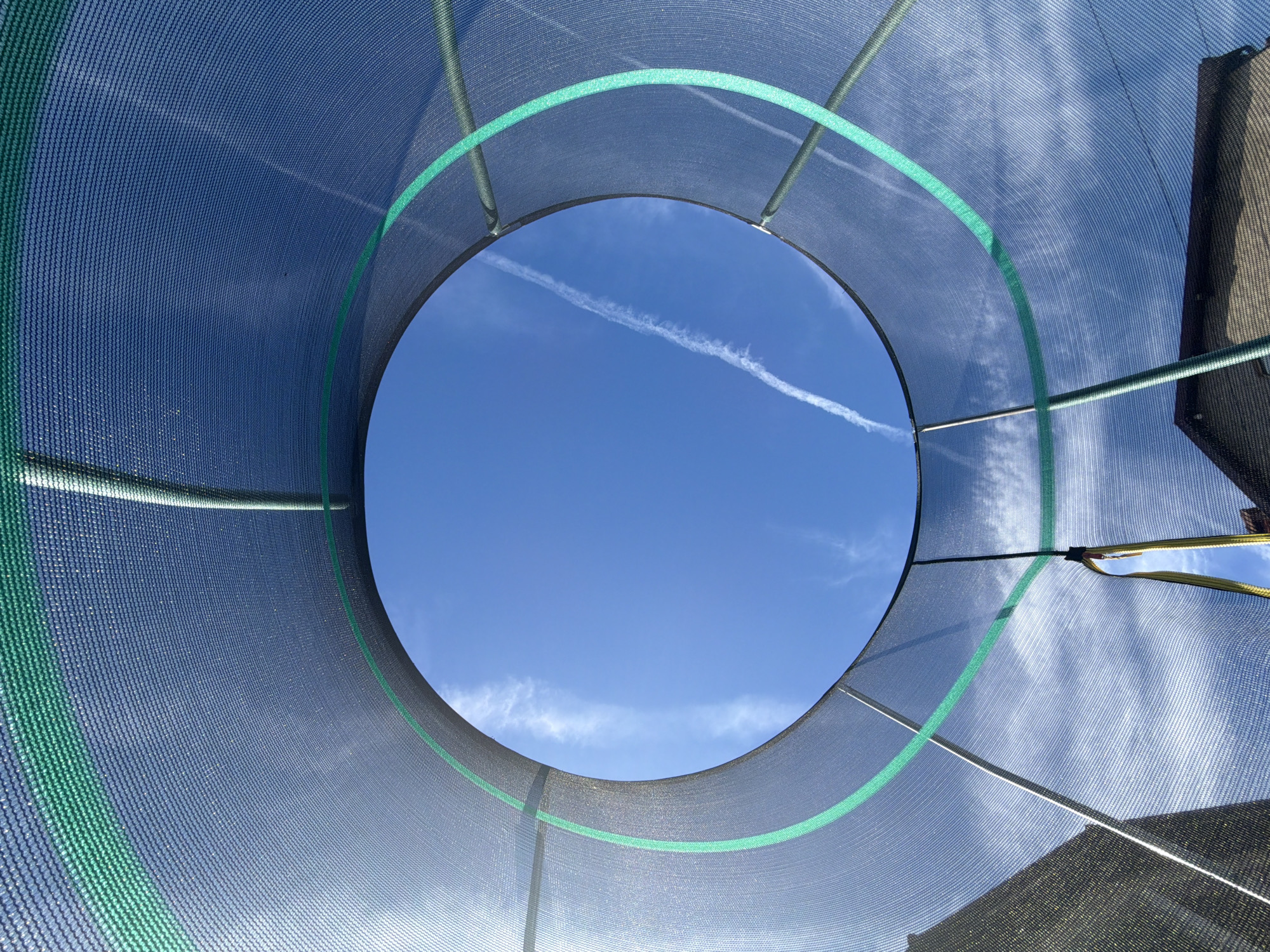 - "A low-angle shot looking upward through the circular opening of a trampoline enclosure in Dolni Dabnik, Bulgaria, reveals a clear, blue sky punctuated by a single contrail" by FM-hvjyT2, licensed under CC BY 4.0
