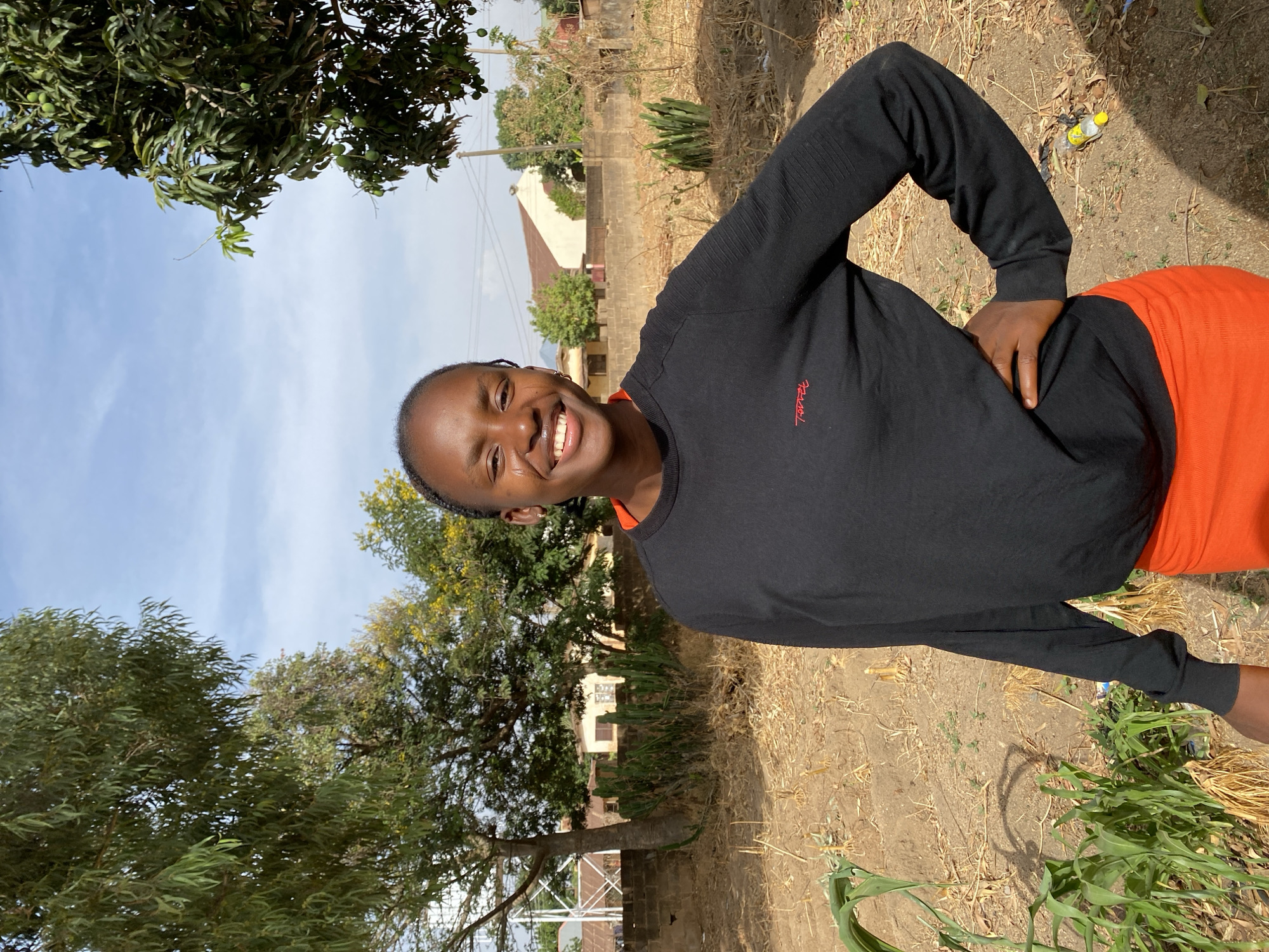 The image depicts a young Black woman standing outdoors in Kuru Dungus, Nigeria. She is smiling broadly, revealing her teeth, and has a visible scar or marking near her left eye. Her dark hair is styled in short braids. She wears a black long-sleeved top with "Torrez" embroidered in red on the left chest, over bright orange lower garments. Her right hand rests on her hip. The immediate foreground shows dry, bare earth with scattered crop stubble and sparse green vegetation. In the mid-ground, a low concrete block wall is partially obscured by tall, green, succulent plants. Beyond the wall, several residential buildings with varying roof colors are visible among numerous trees. One tree features yellow flowers, and another bears green, immature fruit. A metallic water tower is present in the distant left background. The sky is light blue with scattered white clouds, indicating daylight conditions.