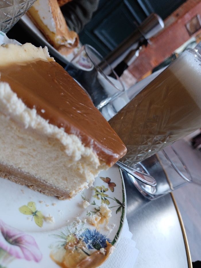 The image displays an indoor scene within a café or restaurant, with a focus on desserts and beverages. In the foreground, a partially consumed slice of cheesecake with a thick caramel topping over a creamy white cheese layer and a biscuit crust rests on a white ceramic plate. The plate is decorated with illustrations of yellow butterflies, purple, and blue flowers, with cheesecake crumbs and caramel residue present on its surface. To the right of the cheesecake, a tall, clear, faceted glass holds a light brown, frothy beverage, consistent with a latte or iced coffee. A silver-colored metal spoon lies beside this glass. Further in the background, another empty, clear glass is visible. Behind these items, a second dessert, possibly a pastry with a browned or toasted meringue-like topping, is presented on a rectangular white plate. The items are placed on a light-colored, reflective table surface, which appears to have a golden-colored edge. In the background, a person's arm, dressed in dark fabric, is partially visible. Architectural elements consist of dark green paneled walls and a reddish-brown structure. A metallic object, possibly part of a light fixture or decor, is also present. The precise location within Toulouse, France, cannot be determined from the visual evidence provided.
