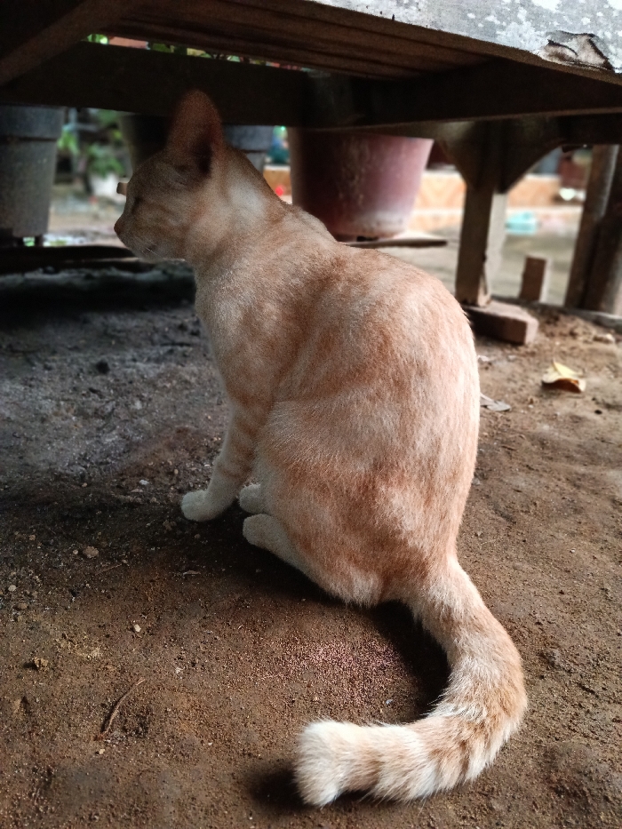 - "An orange and cream tabby cat is seated on a dark brown dirt ground, facing left, partially under a weathered wooden structure in the city of Rheum Barat, Indonesia" by FM-eKNBo1, licensed under CC BY 4.0