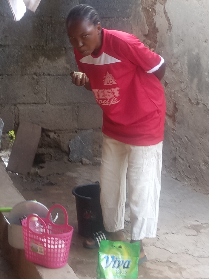 A woman in a red t-shirt and white pants stands in front of a gray brick wall, eating. To her left is a pink plastic basket, a metal pot with a lid, and a black bucket. A green packet labeled "Viva Plus" lies on the ground near her feet. She wears sandals with black and white stripes. Her hair is neatly styled. The setting appears to be an outdoor kitchen or work area.