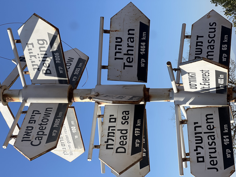 A multi-directional white metal signpost, exhibiting rust at various connection points and along its central pole, stands against a clear blue sky. Numerous arrow-shaped signs extend from the pole, each indicating a prominent location with its distance in kilometers, listed in both English and Hebrew. From the top, signs point to: * "Capetown" (7685 Km) and "Merom golan resort" (100 m) in a northwest direction. * "Beijing" (7006 Km) and "Moscow" (2523 Km) in a northeast direction. Mid-level signs point to: * "Dead sea" (177 Km) in a westward direction. * "Tehran" (1464 Km) in an eastward direction. Lower-level signs point to: * "Jerusalem" (161 Km) in a southwest direction. * "Mt.Everest" (4882 Km) in a south-southwest direction. * "Damascus" (65 Km) in a southeast direction. The presence of the "Merom golan resort 100 m" sign indicates the specific location is in the immediate vicinity of the Merom Golan resort, situated within the Golan Regional Council, Israel. The background shows minimal vegetation with some bare tree branches and sparse green foliage at the bottom right, under bright daylight conditions. No individuals or animals are present in the scene.