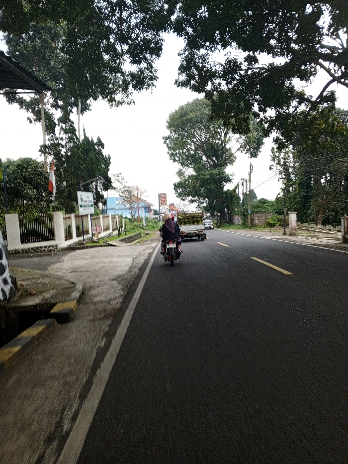 An outdoor scene depicts a two-lane asphalt road with vehicles, roadside structures, and dense vegetation under an overcast sky in Kheda, India. In the immediate foreground on the left, a concrete sidewalk and a drainage ditch with yellow and black markings are visible, alongside a white pillar with black horizontal stripes. A white fence with black decorative elements runs parallel to the road. Behind the fence, a white sign with green text, reading "Eka Esa" and additional Indonesian text, stands next to a red and white flag. Further back on the left, a light blue building and another structure with a large reddish-brown sign are present. On the asphalt road, a white solid line delineates the shoulder, and a yellow dashed line marks the center of the main lanes. A person wearing a dark top and a maroon head covering rides a red motorcycle away from the viewer in the right lane. Ahead of the motorcycle, a light-colored truck is transporting a load of numerous green, round objects, likely coconuts. Another white vehicle follows the truck. The environment is heavily vegetated, with numerous trees featuring dense green foliage forming a canopy in the upper portion of the image and lining both sides of the road. Utility poles are visible on the right side of the road. The sky is uniformly bright and overcast, providing diffused lighting.