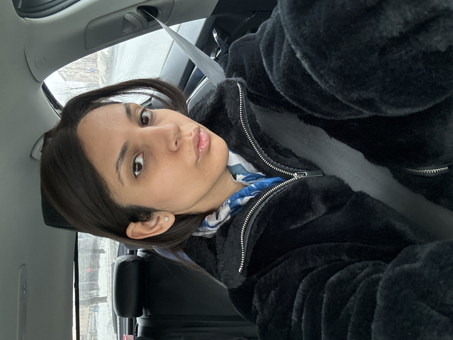 A sole female individual is seated in the front passenger seat of a vehicle, capturing a self-portrait