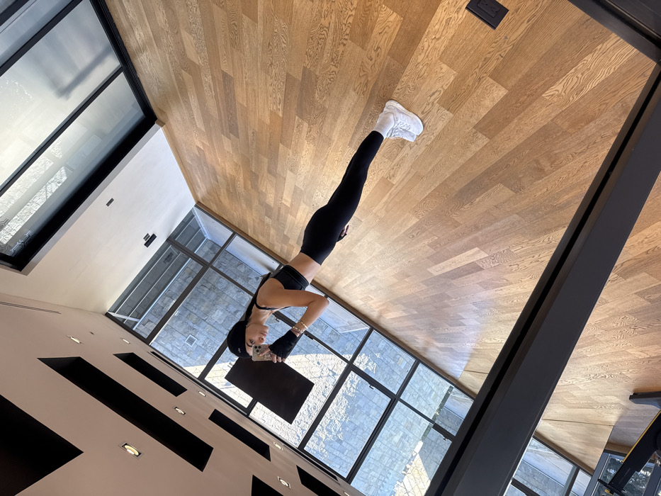 A woman in black leggings and a sports bra stands on a light wood floor with white sneakers. She holds a phone, seemingly taking a photo. Large windows reveal an exterior stone wall. A stark white wall with black rectangular patterns and recessed lighting runs along the left side. A dark structural beam bisects the upper right corner.