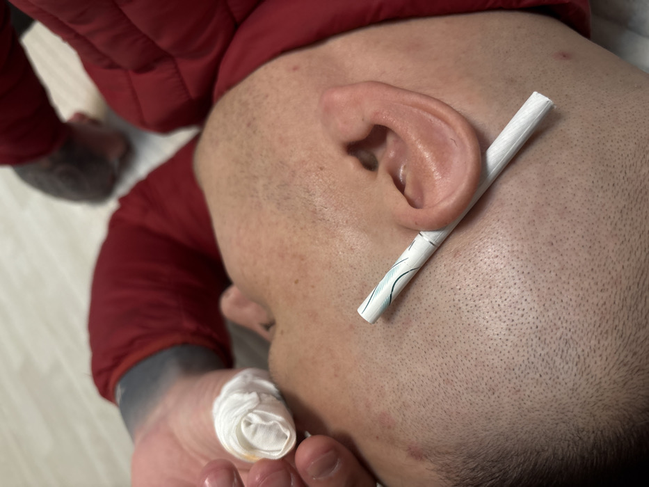 An indoor scene depicts two individuals lying on a light-colored surface. In the foreground, an adult male, with short stubble on his face, is visible lying on his back or right side. He is wearing a red puffer jacket. His right hand is partially visible, with a white bandage or gauze wrapped around his right thumb. A white cylindrical object, approximately 6-8 cm in length with a light blue feather-like design near one end, rests horizontally on his right cheek, partially overlapping his right ear. In the blurred background, the head of a second individual with short, dark hair is discernible, also lying on the light-colored surface. No specific actions or interactions are clearly depicted beyond their recumbent postures. The environment is an indeterminate indoor space with a light-colored floor. The specific location within Izhevsk, Russia, is not determinable from the provided image.